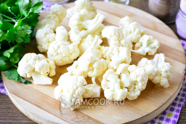 Разделите цветную капусту на средние соцветия. Делайте это руками и при помощи ножа, срезая с центральной кочерыжки.
