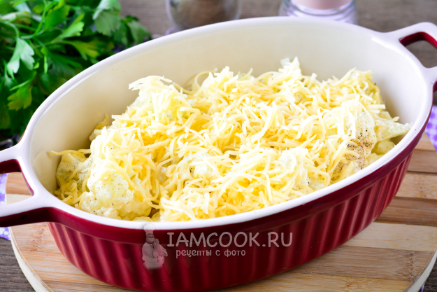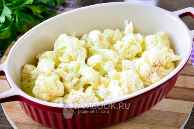 Форму для запекания слегка смажьте маслом, выложите ровным слоем цветную капусту с майонезом.