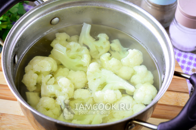Вскипятите воду в кастрюле, слегка подсолите, всыпьте цветную капусту и бланшируйте 3-4 минуты.