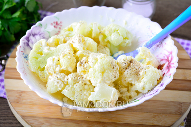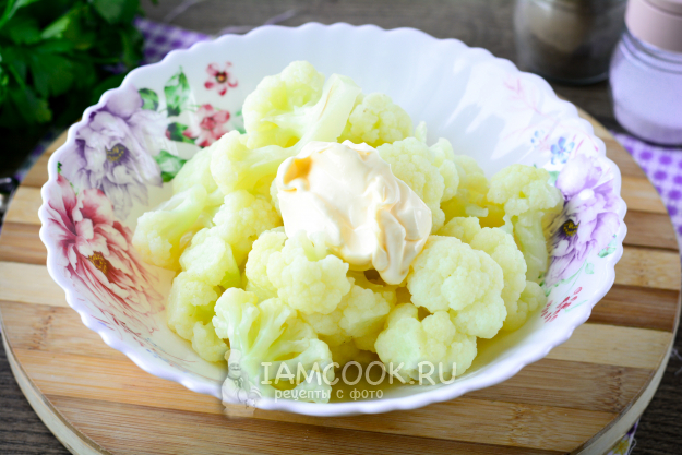 Слейте горячую воду с капусты, соцветия переложите в подходящую емкость. Слегка остудите капусту и добавьте к ней майонез любой жирности.