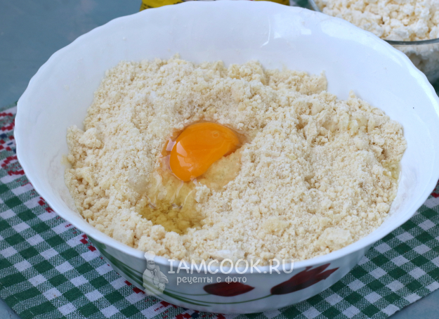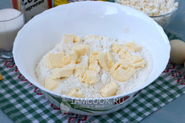 Муку просеять в глубокую миску, добавить сливочное масло и перетереть всё в крошку.