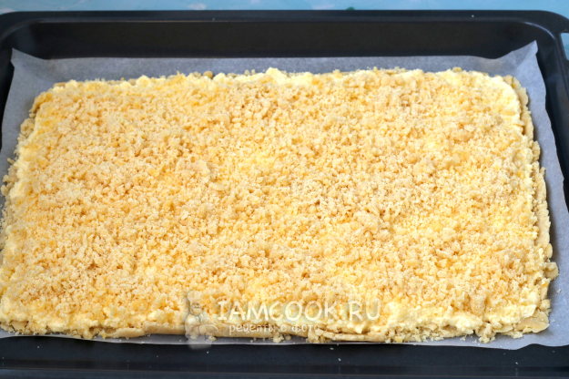 Достать из морозилки оставшееся тесто и натереть его на тёрке. Распределить равномерно по поверхности.