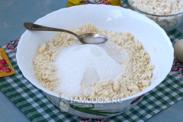 Добавить к полученной крошке сахар, соль и гашеную соду. Перемешать.