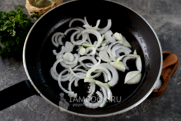 Готовится блюдо на умеренном огне. Разогрейте в сковороде немного растительного рафинированного масла, выложите в него нарезанный полукольцами лук, обжарьте пару минут до мягкого состояния.