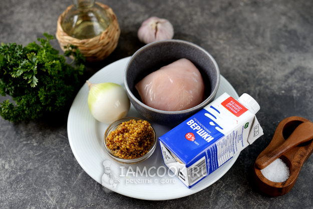Возьмите продукты для приготовления курицы в горчичном соусе на сковороде. Лук и чеснок очистите от шелухи, куриное филе помойте вместе с луком, вытрите бумажными полотенцами.
