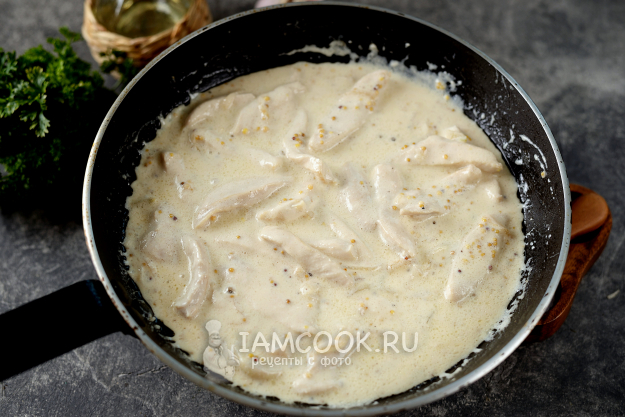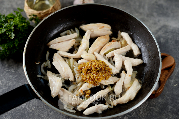 Положите к курице раздавленный зубчик чеснока и столовую ложку с горкой сладкой зерновой горчицы. Обжарьте все около минуты.