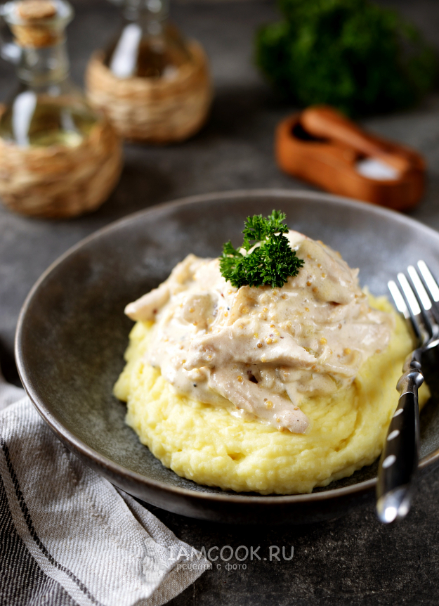 Приготовленную на сковороде курицу в горчичном соусе (очень нежном и вкусном!) идеально подать с картофельным пюре.