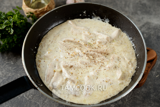 Влейте жирные сливки, доведите до кипения. Как только они начнут густеть, посолите и поперчите соус по вкусу.