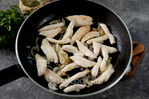 Куриное филе нарежьте тонкой соломкой, переложите в сковороду к луку, обжарьте минут 5-7, оно должно хорошо побелеть. Готовится филе очень быстро, часто повара советуют обжаривать его не дольше 10 минут в общем.