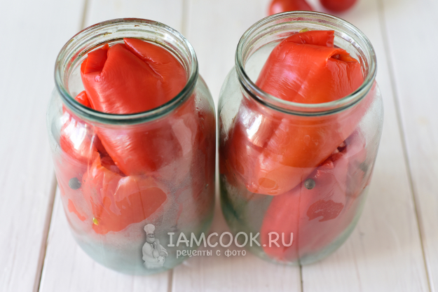 Поставить банки с прикрытыми крышками на дно кастрюли с кипящей водой. Стерилизовать таким образом банки с перцами 15 минут.