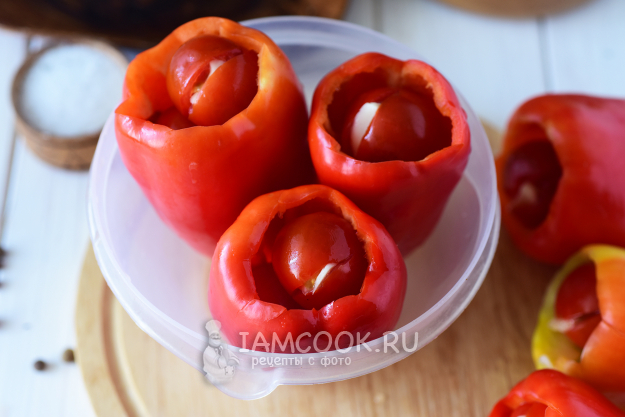 Каждый подготовленный таким образом перец заполнить помидорками черри с чесноком. Не надо плотно заполнять полости перцев, так как будет потом неудобно укладывать их в банки. У меня в каждый перец помещалось от 3 до 5 помидорок, зависит от размеров черри. В этот момент удобно будет поставить на плиту кастрюлю с водой на максимальный огонь для последующей стерилизации.