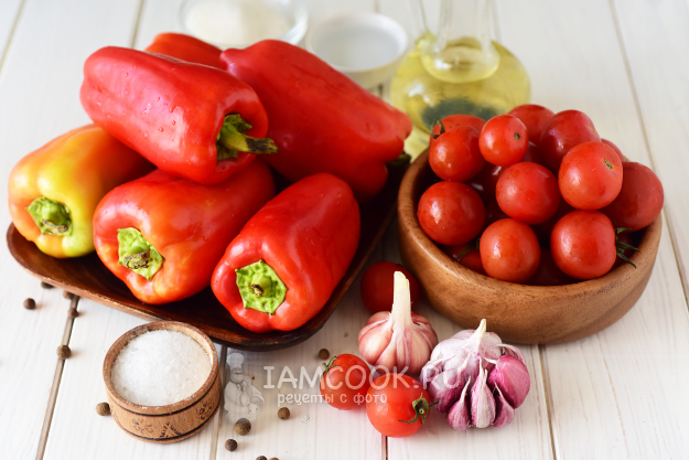 Подготовить все ингредиенты для заготовки перцев, фаршированных помидорами, на зиму. Перцы и помидоры помыть. Чеснок очистить.