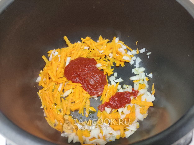 На экране мультиварки-скороварки установите программу "Жарка". Через 1-2 минуты, когда чаша разогреется, обжарьте на подсолнечном масле натертую на крупной терке морковь, мелко нарезанный репчатый лук и томатную пасту. Постоянно помешивайте зажарку. Крышкой не накрываем. Готовую зажарку переложите в отдельную посуду.