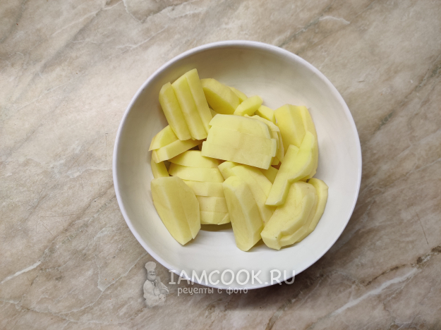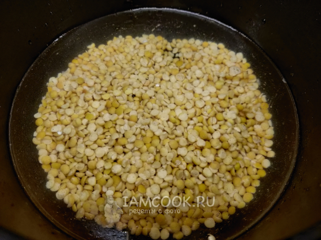 Я люблю, когда горох в супе превращается в пюре, поэтому отвариваю его отдельно. Горох переложите в чашу мультиварки и залейте 0.5 л фильтрованной воды. Закройте крышку и клапан. Варите 5 минут с программой "Варка". Давление - 3 (высокий уровень).