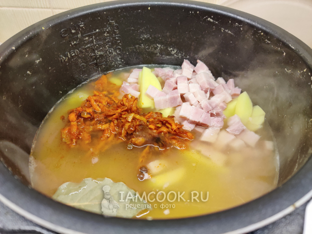 Через 5 минут после окончания программы варки гороха, стравите давление и аккуратно откройте крышку. Долейте в чашу мультиварки оставшиеся 1.5 л фильтрованной воды. Добавьте картофель, грудинку, зажарку, лавровый лист и душистый перец горошком. Закройте крышку и клапан. Выберите программу "Варка" и варите гороховый суп в мультиварке-скороварке еще 20 минут - до готовности. Давление - 3 (высокий уровень).
