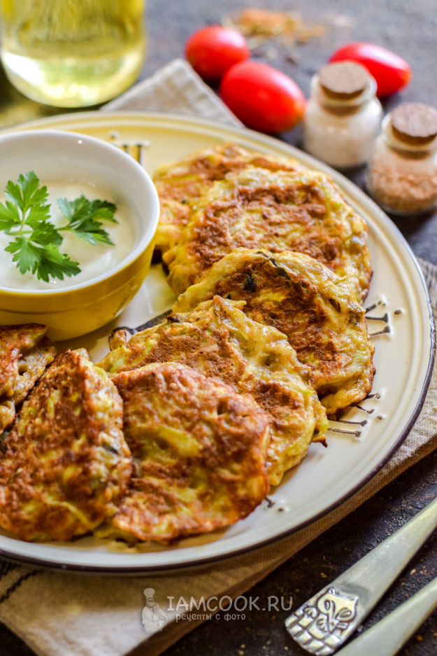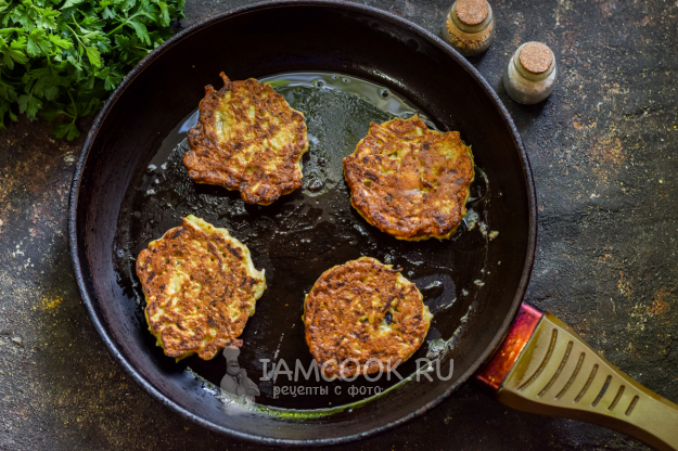 Выложить на сковороду тесто при помощи столовой ложки, жарить оладьи с каждой стороны по 3-4 минуты на небольшом огне. Также готовые оладьи из кабачков и баклажанов можно выложить на противень, посыпать тертым сыром и запекать еще 10 минут.