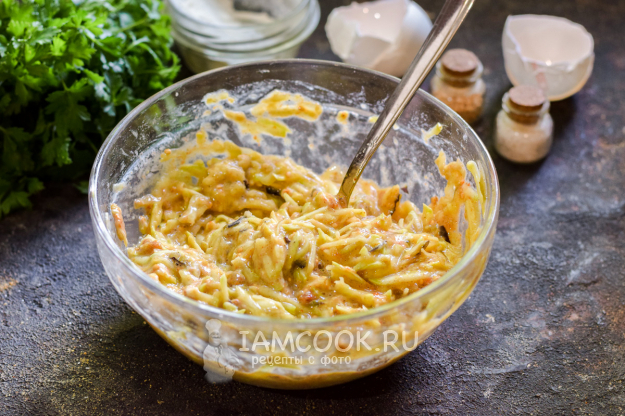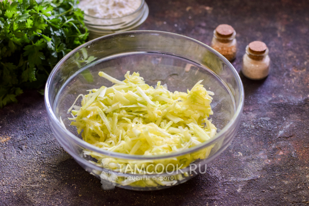 Кабачок вымыть и просушить, обрезать концы с обеих сторон. Натереть кабачок на средней терке, отжать, переложить в миску.