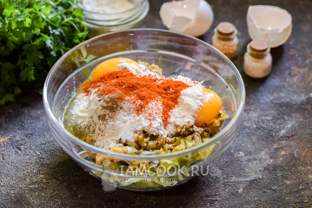 Добавить в миску пшеничную муку, соль, перец, сухой чеснок, паприку. По желанию можно добавить горсть нарезанной зелени и специи по своему вкусу, сухие травы.