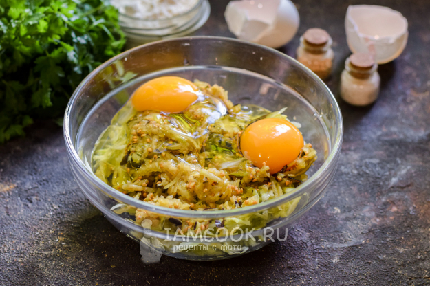 Вбить в миску к кабачкам и баклажанам два куриных яйца.
