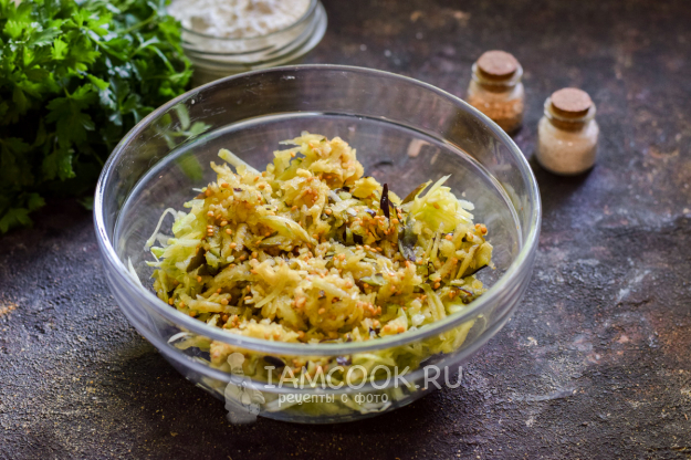 Баклажан также ополоснуть и просушить, обрезать концы с обеих сторон. Баклажан натереть на средней терке, посыпать солью и оставить на 10 минут, после отжать лишнюю жидкость, добавить баклажан к кабачкам.