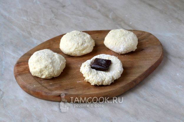 Творожную массу разделите на 9 равных частей. Из каждой части сформируйте лепёшку. Если сделать это будет тяжело - смочите ладони водой или присыпьте немного мукой. На каждую лепёшку выложите по кусочку шоколада и соедините края так, чтобы начинка оказалась внутри. Таким образом подготовьте все сырники.