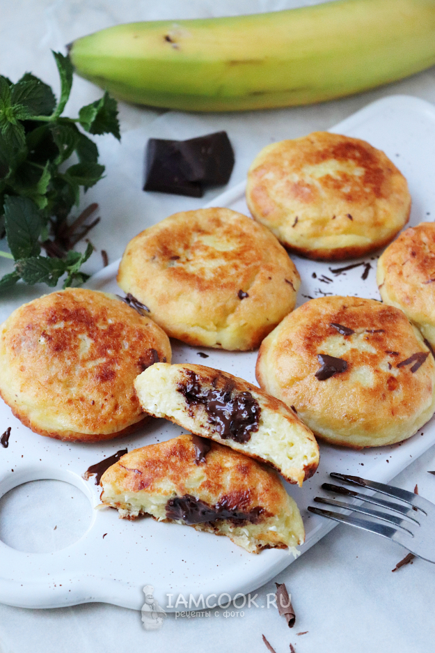 Вкуснейшие сырники с бананом и шоколадом можно подавать на стол.