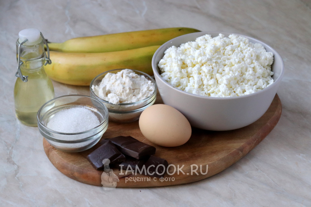 Для приготовления творожных сырников с бананом и шоколадом внутри подготовьте из списка необходимые ингредиенты. Творог лучше взять средней жирности (у меня 5%), не слишком мокрый, но и не полностью сухой. Шоколад можно использовать как чёрный, так и молочный, на ваше усмотрение.