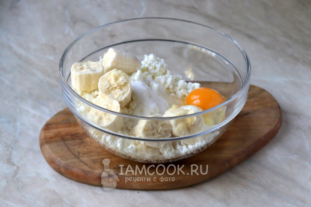 В глубокой миске соедините творог, сахарный песок, яйцо и спелый мягкий банан, очищенный и поломанный на кусочки.