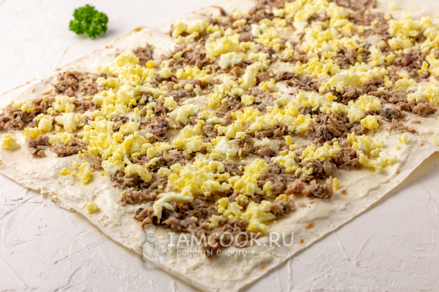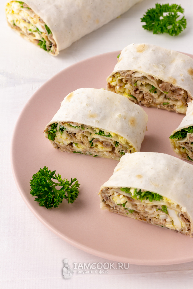Рулет из лаваша со скумбрией и яйцами готов! Сразу можно подавать на стол и кушать.