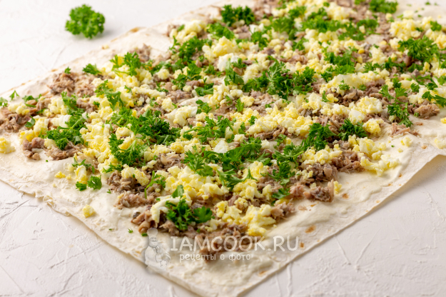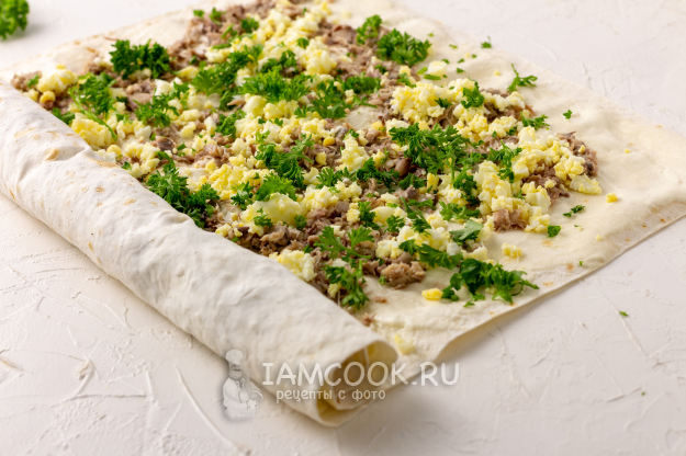 Осталось аккуратно свернуть лаваш в рулет. Делайте это медленно, чтобы случайно не порвать лаваш.