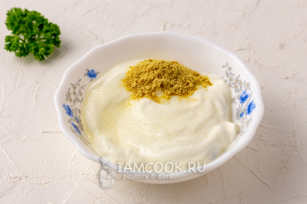 Ну а пока будут вариться яйца, будем готовить дальше. В миске соединяем сметану, соль, сахар и сухую горчицу (можно и приготовленную), размешиваем и пробуем на вкус. Если что-то не устраивает, корректируем по вкусу.