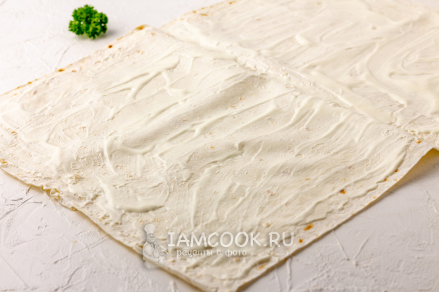Лист лаваша смазываем равномерно соусом по всему периметру.