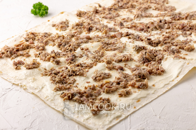 Открываем консервированную скумбрию и сливаем жидкость. А саму скумбрию разминаем вилочкой и выкладываем равномерно на лист лаваша.