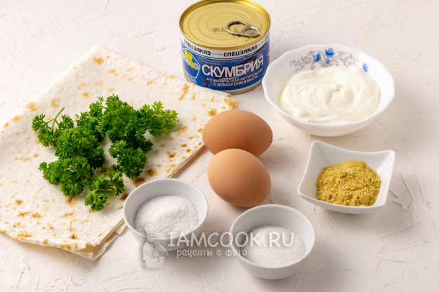 Подготовьте ингредиенты для рулета из лаваша со скумбрией (консервированной) и яйцами.