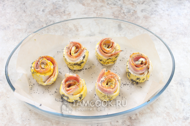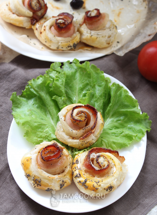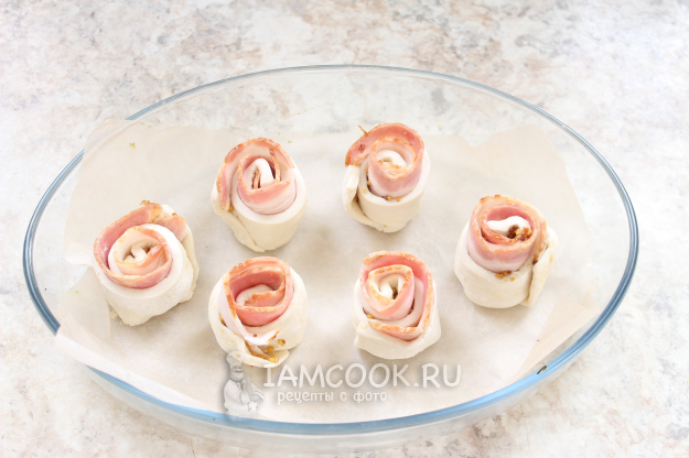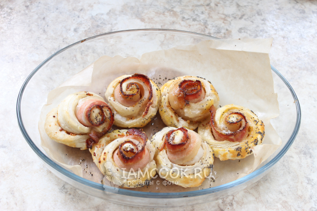 Выпекаем розочки из слоеного теста с беконом в разогретой духовке при 180 градусах. Около 25-30 минут.