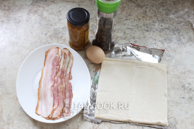 Подготовим все необходимое для приготовления розочек из слоеного теста с беконом.