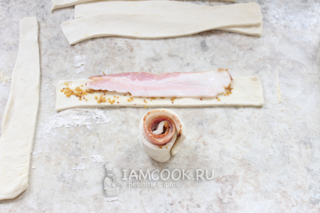 Выкладываем на горчицу тонкие ломтики бекона, так, чтобы край бекона выходил за края теста. Сворачиваем тесто - получается розочка, края бекона в итоге должны выглядывать.