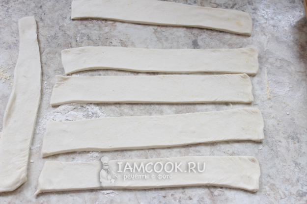 Тесто предварительно разморозим, тонко раскатаем. Нарезаем тесто на полоски, из одного листа слоеного теста у меня вышло 6 полосок.