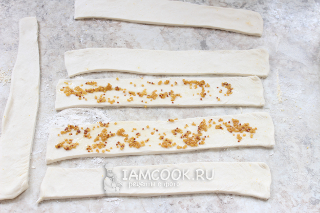 Смазываем каждую полоску теста зернистой горчицей, стараемся распределить ее равномерно.