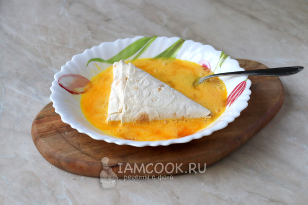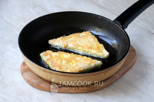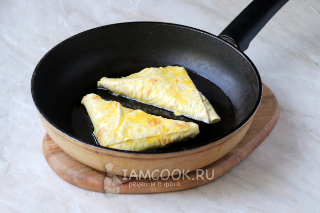 Затем окуните конвертики во взбитое яйцо и выложите на разогретую с растительным маслом сковороду.