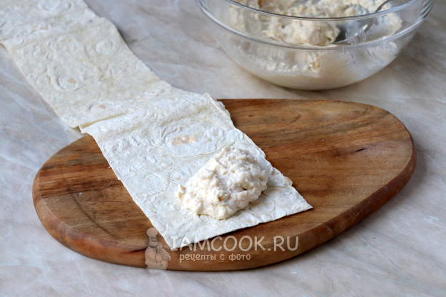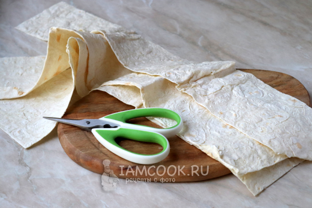 Разрежьте лаваш на длинные полосы, шириной около 8-10 см (как на фото).