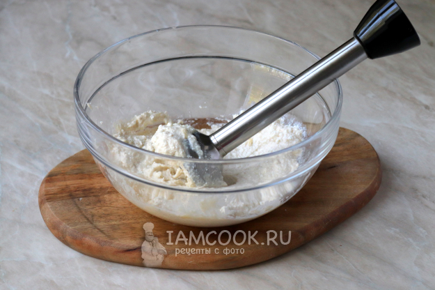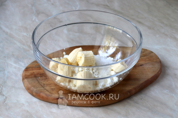 В глубокой миске соедините творог, сахар и банан. Количество сахара можно регулировать самостоятельно, учитывая сладость банана и ваши личные предпочтения.