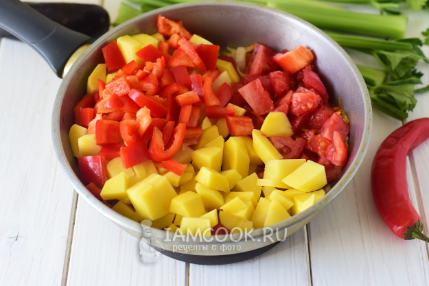 В сковороду к луково-морковной смеси закинуть кубики помидоров, картофеля и перца. Также закинуть к овощам четвертую часть стручка перчика чили, предварительно освободив ее от семян и порезав на несколько частей. Залить 50 мл воды к овощам, перемешать и оставить тушиться под закрытой крышкой на минимальном огне 20 минут.