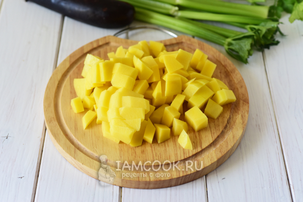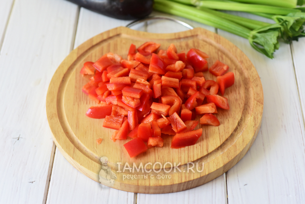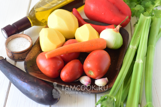 Подготовить все ингредиенты для овощного рагу с сельдереем. Перцы очистить от семян и помыть. Помидоры, баклажан, сельдерей помыть. Картофель, морковь, лук почистить и помыть. Чеснок почистить.
