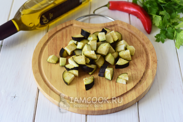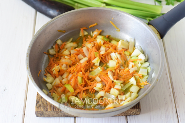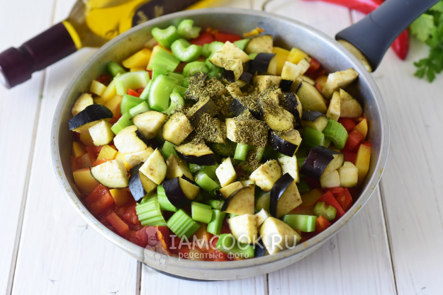 Добавить в сковороду к овощам сельдерей и баклажан, также посолить и добавить специи.