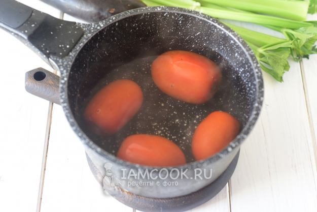 В кастрюле довести до кипения воду. Выложить в кипящую воду помидоры на 40 секунд и выловить их шумовкой.