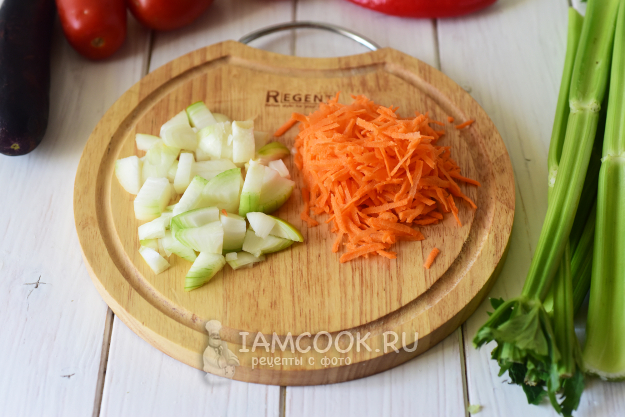 Морковь натереть на крупной терке, лук мелко нашинковать.