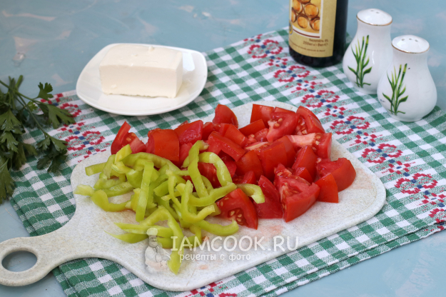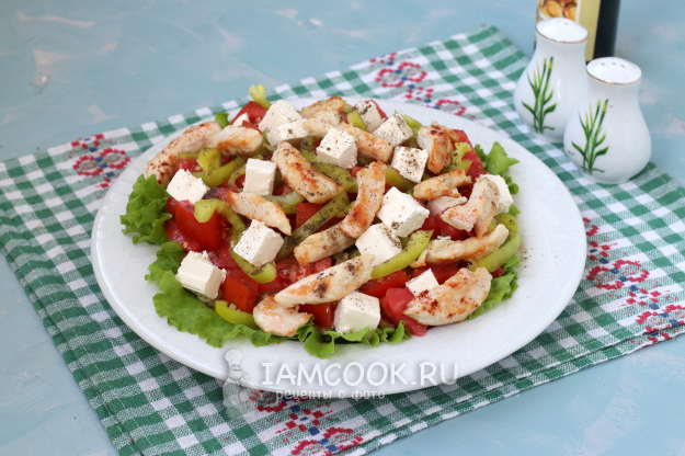 Затем выложить кусочки курицы и нарезанный кубиками сыр фета. Сверху приправить чёрным молотым перцем.