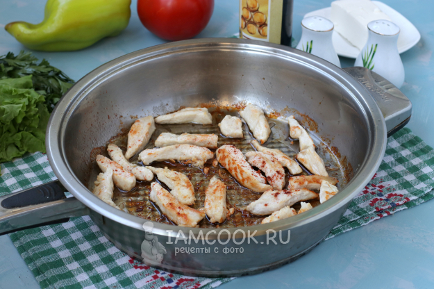 В сковороде хорошо разогреть подсолнечное масло и обжарить в нём кусочки курицы до румяной корочки, приправить солью и перцем. Жарить необходимо на сильном огне, чтобы кусочки мяса мгновенно покрылись корочкой и остались внутри сочными.