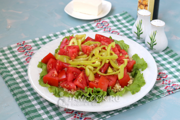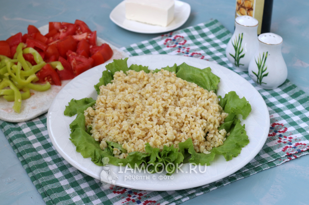 На блюдо порвать листья салата, сверху выложить остывший булгур.